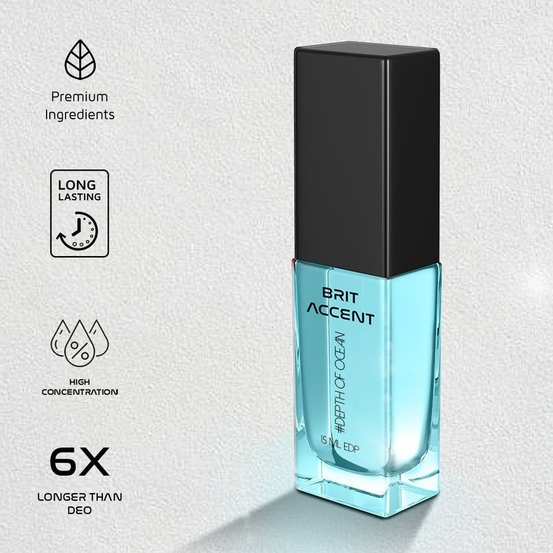Experience the power of the sea with Brit Accent #Depth of Ocean, a high-performance 15ml Eau De Parfum designed for the man who stays active and fresh. This isn't just a regular fragrance; it is a high-concentration EDP formula that is specifically engineered to be 6X longer-lasting than a standard deodorant, ensuring you smell great throughout the day.