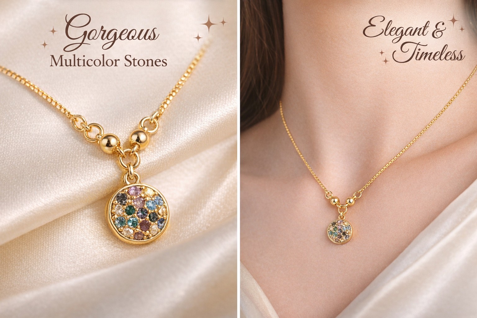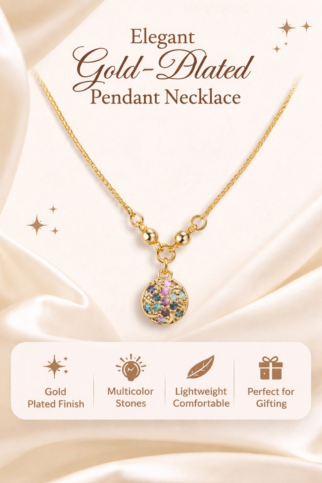 Elevate any outfit with this stunning gold-toned necklace featuring a delicate chain and a charming, spherical pendant adorned with vibrant, multi-color stones. This piece offers a sophisticated look suitable for both everyday wear and special occasions.