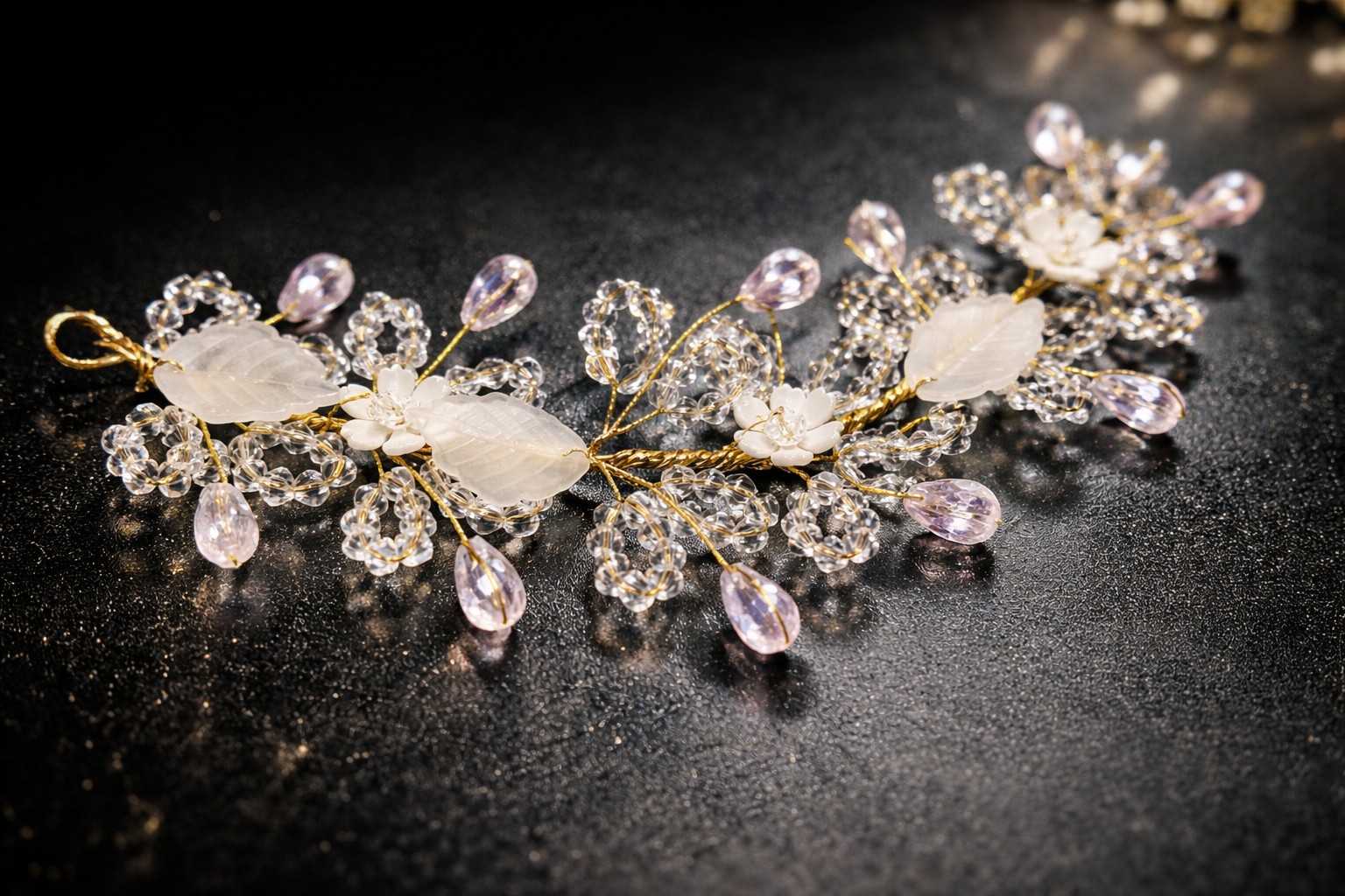 Enhance your bridal look with this luxury crystal floral hair vine, beautifully handcrafted with gold wire, pearl flowers, and premium crystal beads. Designed for modern brides, this elegant wedding hair accessory adds a royal and delicate floral touch to bridal buns, open hairstyles, and wedding reception looks. Lightweight, flexible, and easy to style, this designer bridal hair jewelry is perfect for weddings, engagements, receptions, and festive occasions. Ideal choice for brides who want a premium, elegant, and timeless hair accessory.