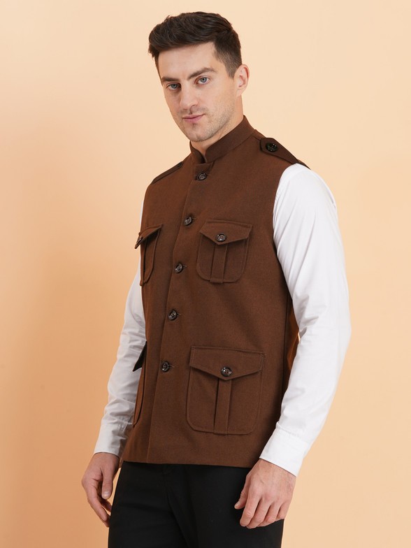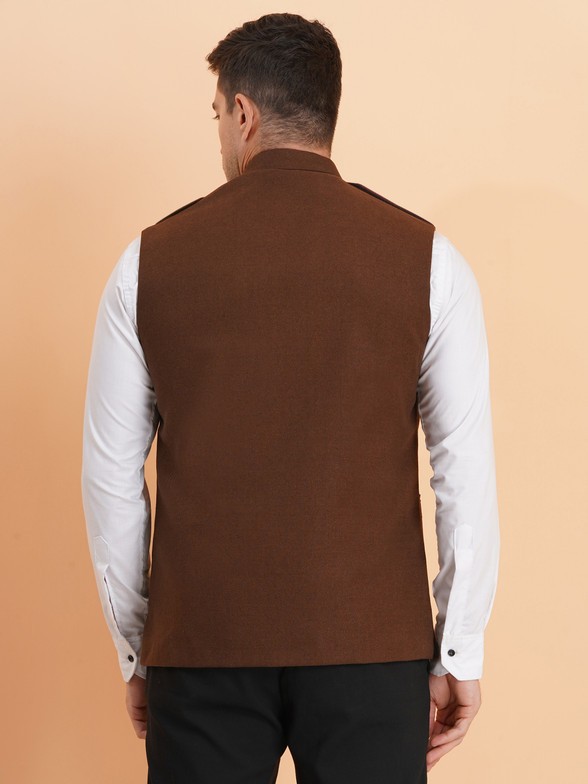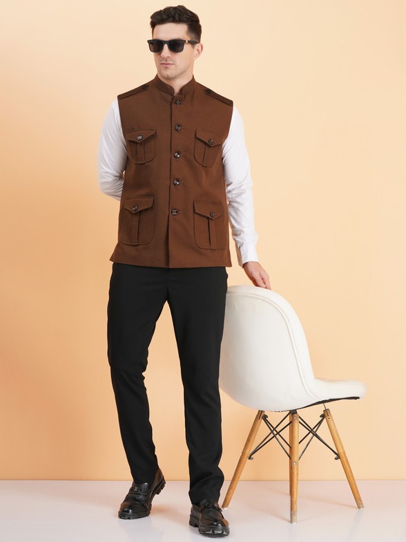 Elevate your ethnic and formal style with this sophisticated men's brown Nehru jacket. This waistcoat features a classic mandarin collar and a full button placket for a refined look.