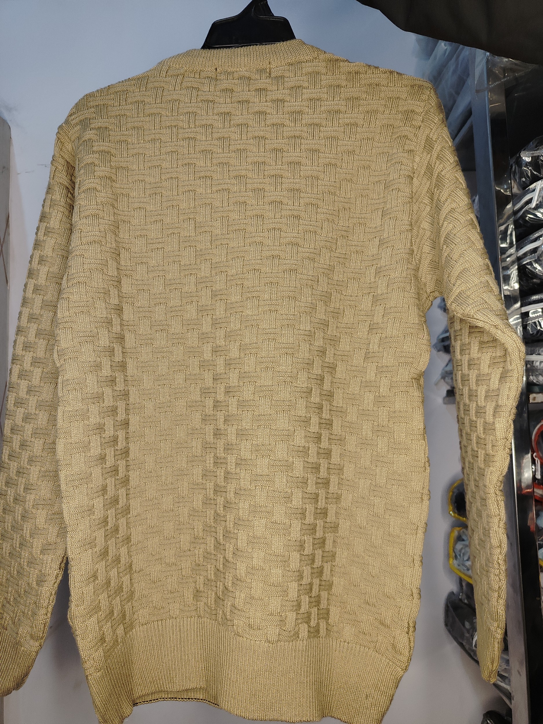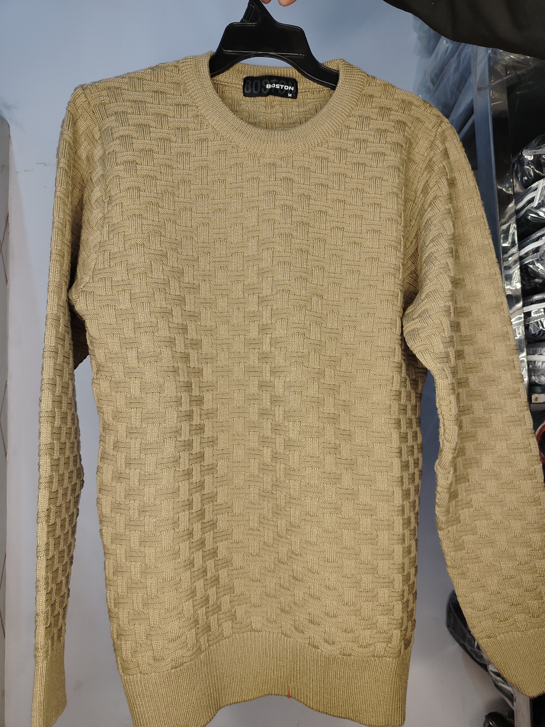 This men's garment is a beige textured crew neck sweater by the brand BOSTON. It is a pullover style with a textured knit pattern, long sleeves, and a regular fit. The specific material appears to be an acrylic or cotton blend based on similar products.