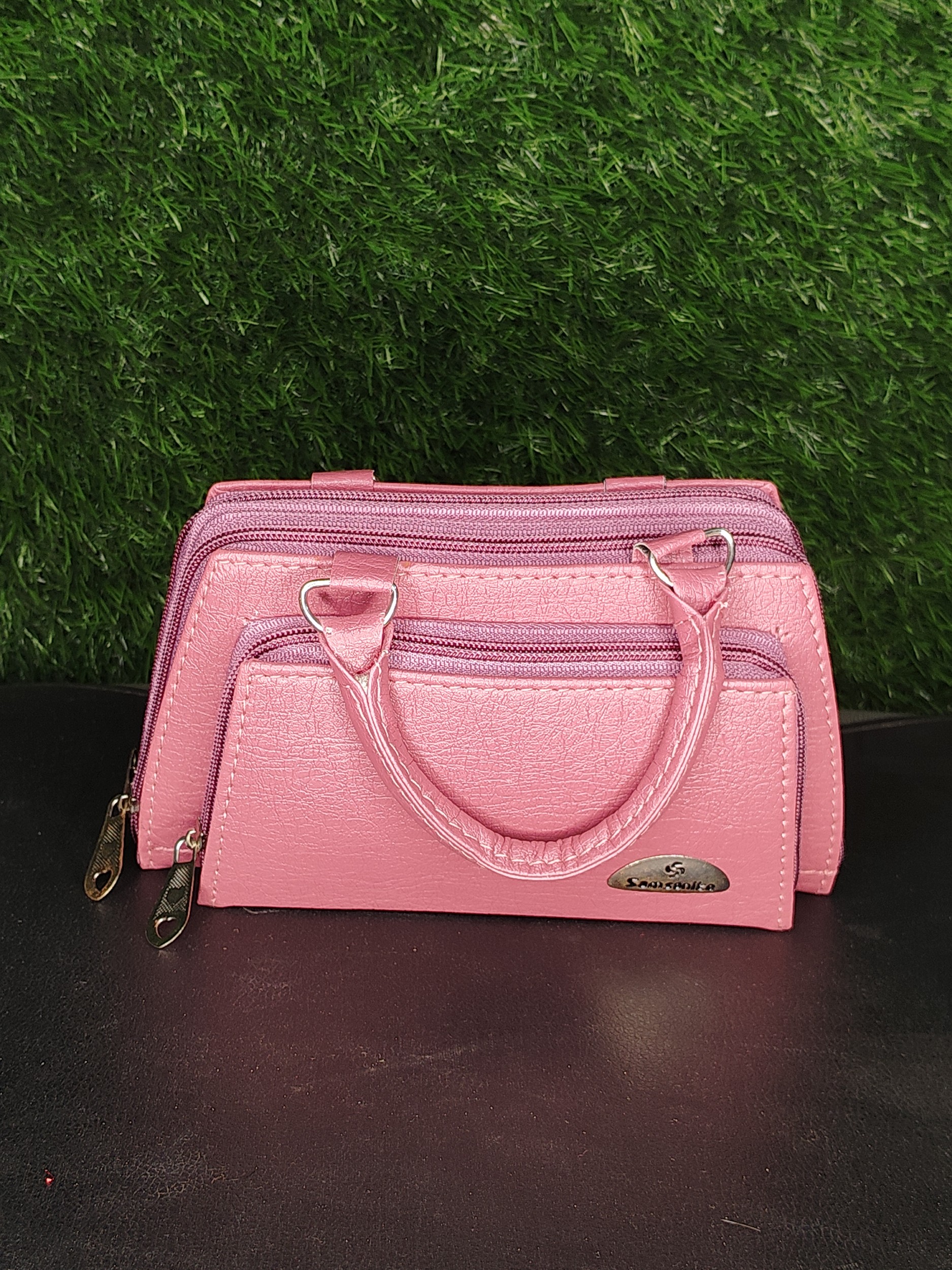 Stylish Design: This handbag features a charming pink hue and a structured silhouette. It has two short handles for easy carrying and a textured synthetic or faux leather exterior, offering a balance of fashion and durability.