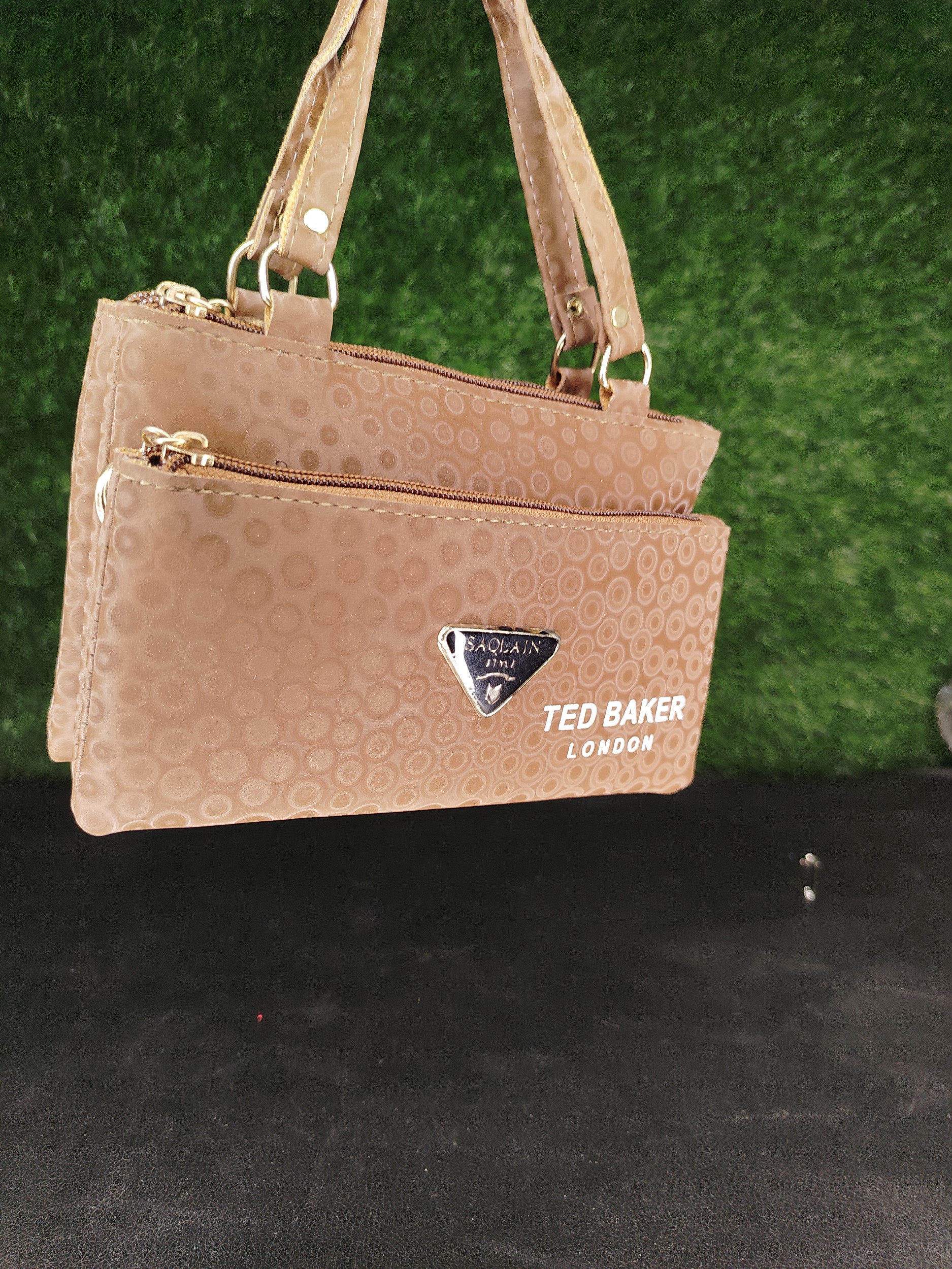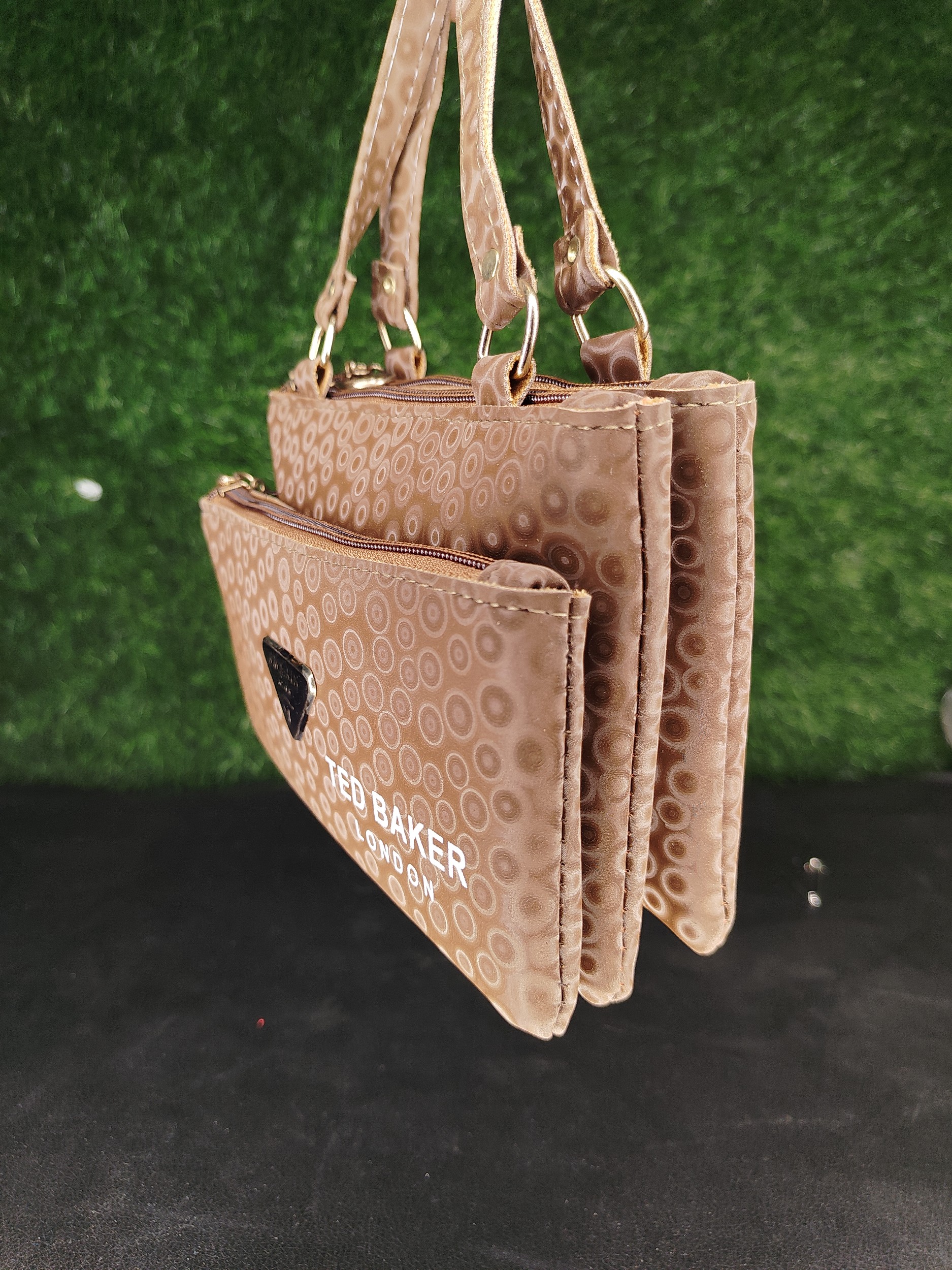 Equipped with elegant, thin carrying straps with gold-tone hardware