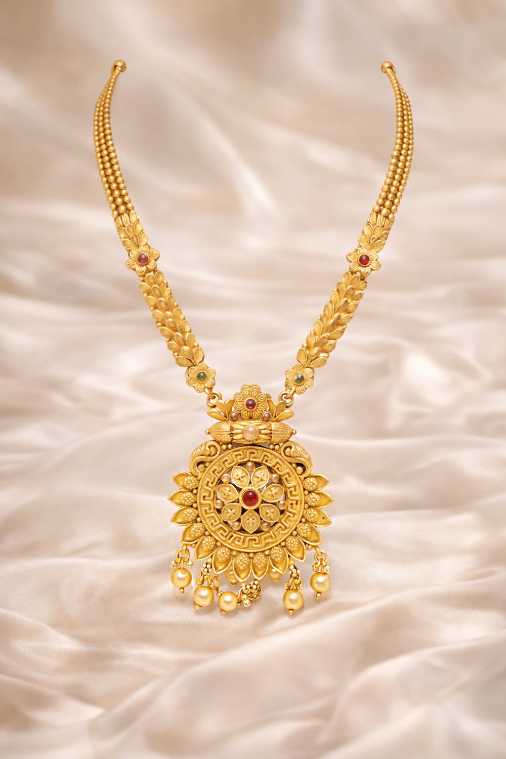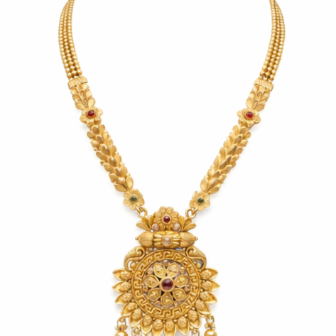 Design: The necklace boasts a detailed design with floral and leaf motifs along the chain and a prominent, circular pendant.