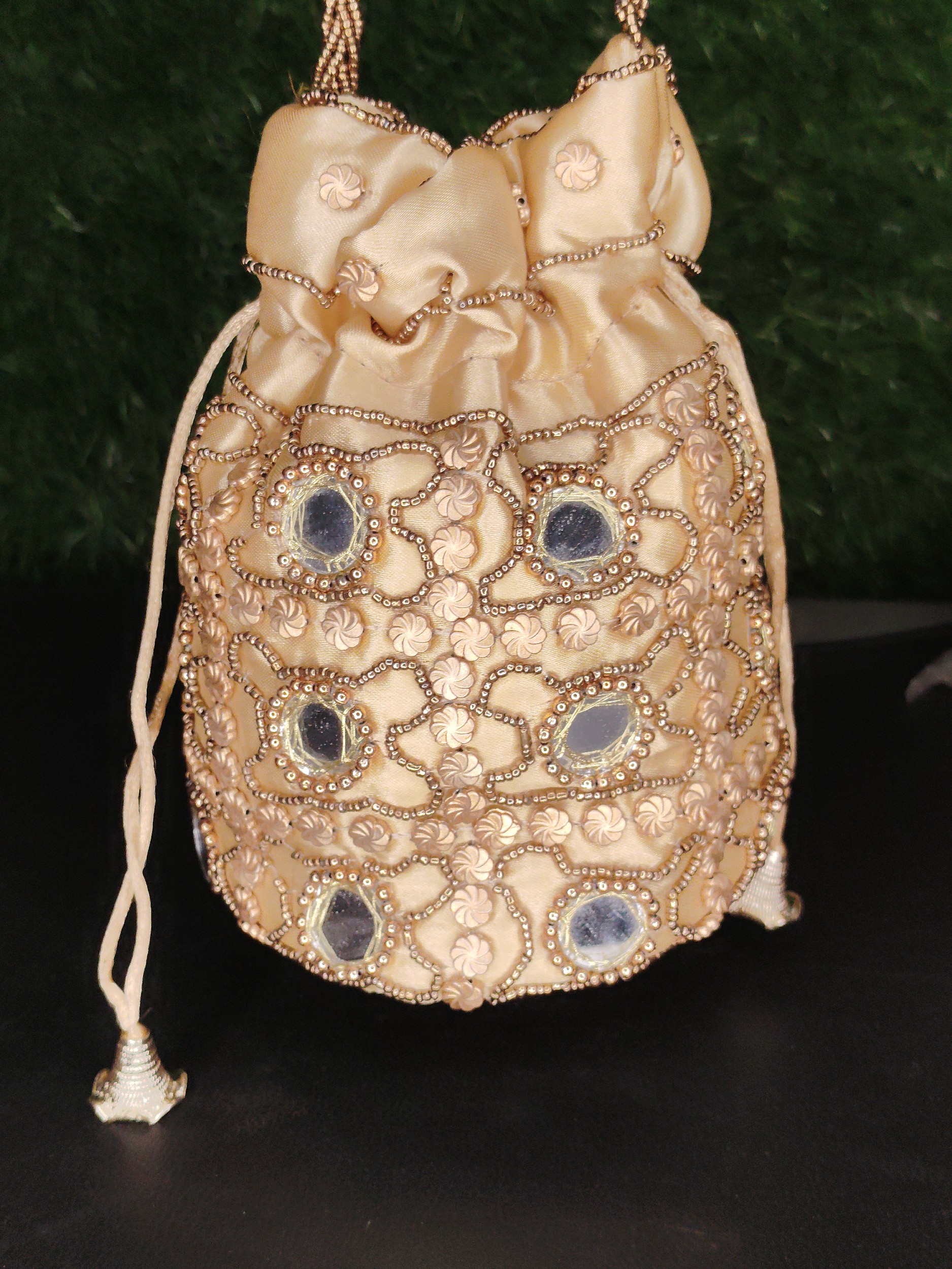 traditional potli bag (also known as a batwa), a stylish Indian handbag that blends ethnic design with functionality. It is crafted from a satin or silk-like fabric in a light, neutral color, likely beige or gold.