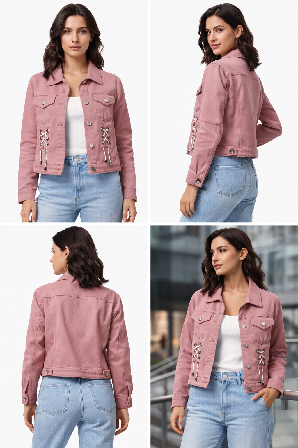 Elevate your casual wardrobe with this chic and stylish pink denim jacket. Crafted from a durable and comfortable cotton-blend fabric, this jacket is perfect for layering and adding a pop of color to any outfit. The standout feature is the unique white lace-up detailing on both sides of the front, offering an edgy yet feminine touch.